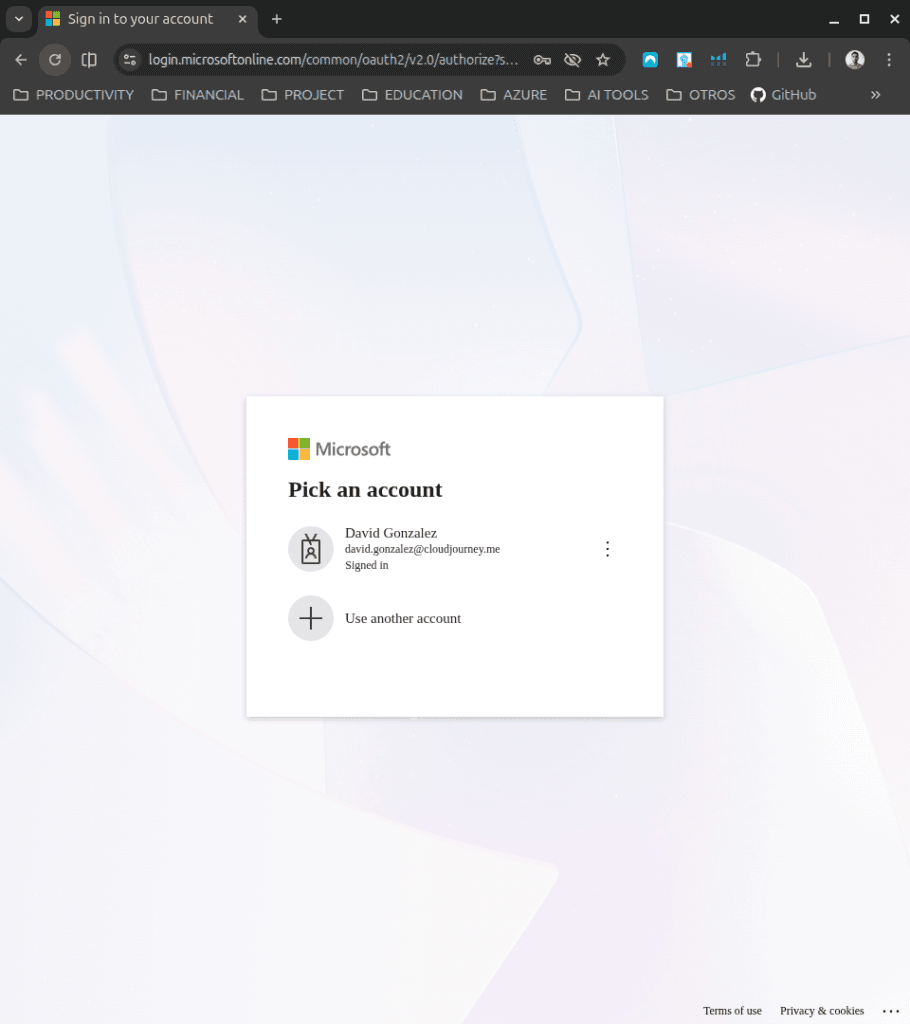 Al ejecutar este comando, se abrirá una ventana en tu navegador web pidiéndote que inicies sesión con tus credenciales de Azure y que consientas los permisos para la aplicación de Microsoft Graph.