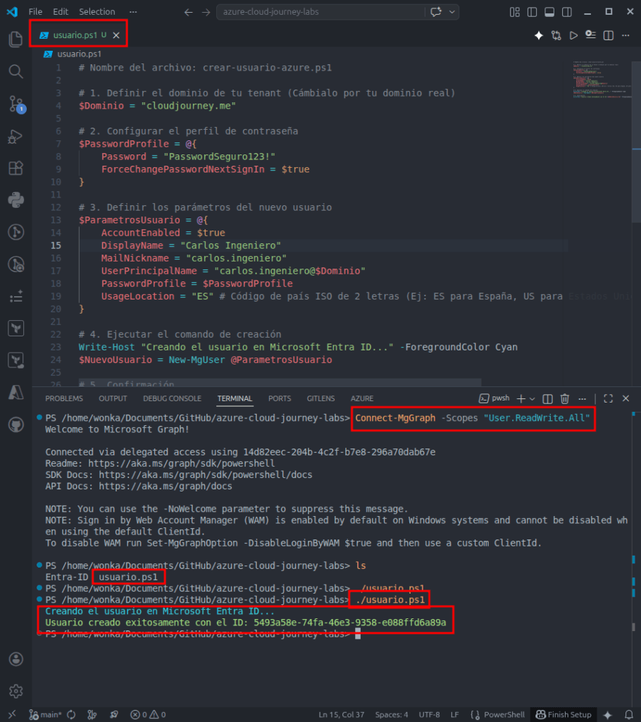 ¡Misión cumplida! Has logrado crear un usuario en Azure utilizando PowerShell desde Visual Studio Code mediante el SDK moderno de Microsoft Graph. Al dominar esta técnica, das un gran paso hacia la automatización de la administración de identidades en la nube, algo vital para cualquier entorno empresarial a gran escala. Te animo a que modifiques el script e intentes usar un archivo CSV para importar múltiples usuarios a la vez en tu próximo experimento.